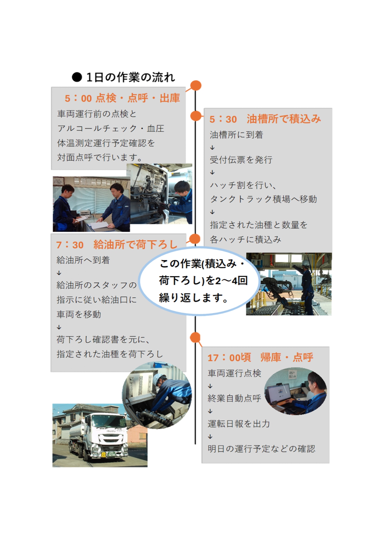 | 仕事内容 | ・石油タンクローリー車による主に県内給油所及び大口需要企業への石油類の配送 ・1日の仕事の流れ 運行前点検(点呼)をおこない、積込み(油槽所など)、配送荷下ろしのサイクルを 1日に2回から4回繰り返します。 |